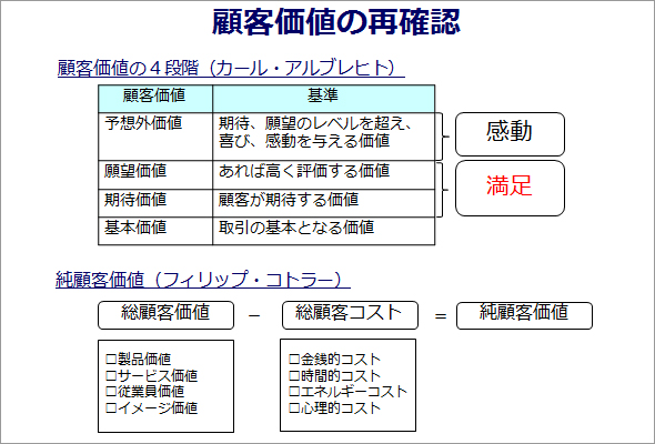 顧客価値の4段階(カール・アルブレヒト)と、純顧客価値(フィリップ・コトラー)