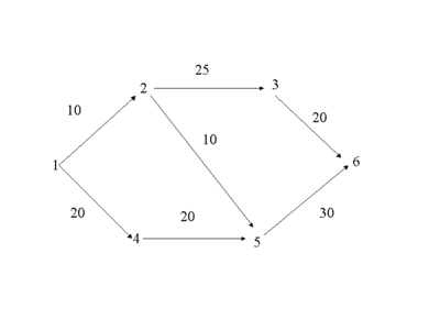 \( P=\{1,2,3,4,5,6\} \\ V=\{(1,2),(1,4),(2,3),(2,5),(3,6),(4,5),(5,6)\} \\ L(1,2)=10, L(1,4)=20, L(2,3)=25, \\ L(2,5)=10, L(3,6)=20, L(4,5)=20, \\ L(5,6)=30 \)