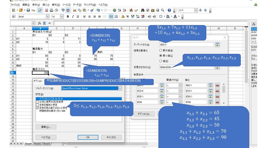 のとき輸送コストの総和 $x_{1,1}+7x_{1,2}+11x_{1,3}+10x_{2,1}+6x_{2,2}+3x_{2,3}$ が最小値750になることを示している. 表2-1,表2-2の制約条件を満たしている.