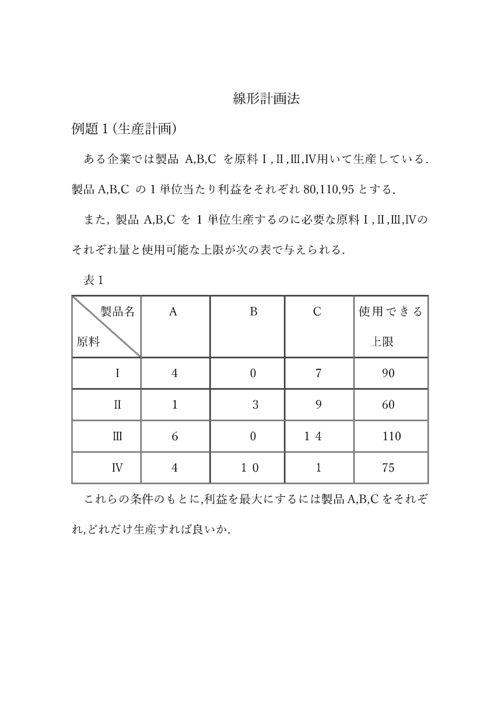次の例題と解答 ファイル:生産計画.pdf を参考にして 次の問題を解くこと。