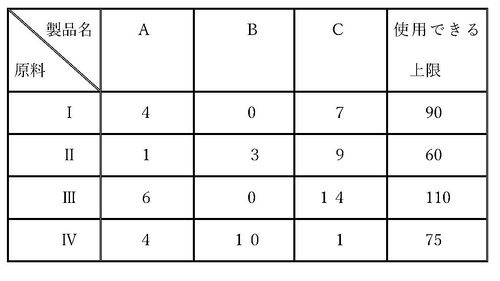 生産計画で述べた条件と全く同様に,企業では製品A,B,Cを原料Ⅰ,Ⅱ,Ⅲ,Ⅳ用いて生産している. 製品A,B,C の1単位当たり利益をそれぞれ80,110,95とする. また, 製品A,B,Cを1単位生産するのに必要な原料Ⅰ,Ⅱ,Ⅲ,Ⅳのそれぞれ量と使用可能な上限が次の表で与えられる. これらの条件のもとに,利益を最大にするには製品A,B,Cをそれぞれ,どれだけ生産すれば良いか?. ただし,生産量は整数値でなければならない。