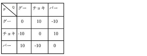 「-10」は\(Q\)に10円払う事を表す. \(P\)の立場に立ってみる.先ず,このゲームの利得表には鞍点がない. 双方が選択の余地のない「平衡状態」にする戦略はないわけである.出す手をランダムしてゲームを繰り返す方法以外ない. このような問題を混合戦略問題とう. じゃんけんを繰り返すわけであるが,どのような「戦略」があるか?