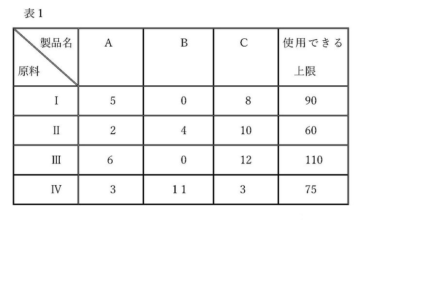 ある企業では製品A,B,Cを原料Ⅰ,Ⅱ,Ⅲ,Ⅳ用いて生産している. 製品A,B,C の1単位当たり利益をそれぞれ80,110,95とする.  また, 製品A,B,Cを1単位生産するのに必要な原料Ⅰ,Ⅱ,Ⅲ,Ⅳのそれぞれ量と使用可能な上限が次の表で与えられる. これらの条件のもとに,利益を最大にするには製品A,B,Cをそれぞれ,どれだけ生産すれば良いか?.