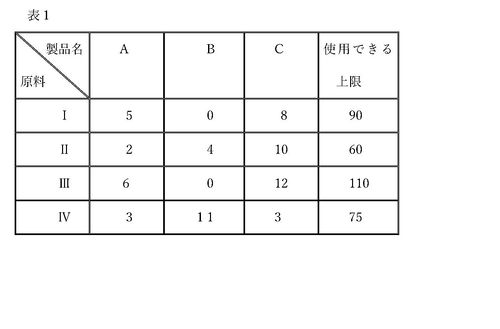 生産計画で述べた条件と全く同様に,企業では製品A,B,Cを原料Ⅰ,Ⅱ,Ⅲ,Ⅳ用いて生産している. 製品A,B,C の1単位当たり利益をそれぞれ80,110,95とする.  また, 製品A,B,Cを1単位生産するのに必要な原料Ⅰ,Ⅱ,Ⅲ,Ⅳのそれぞれ量と使用可能な上限が次の表で与えられる. これらの条件のもとに,利益を最大にするには製品A,B,Cをそれぞれ,どれだけ生産すれば良いか?. ただし,生産量は整数値でなければならない。