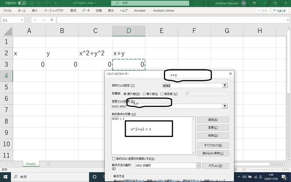 従って 等式拘束条件 \(x^2+y^2=1 \) の下で\(L(x,y)=x+y \) の 最大値は\(x = y= \frac{\sqrt{2}}{2}\)のときで\(\sqrt{2} \)