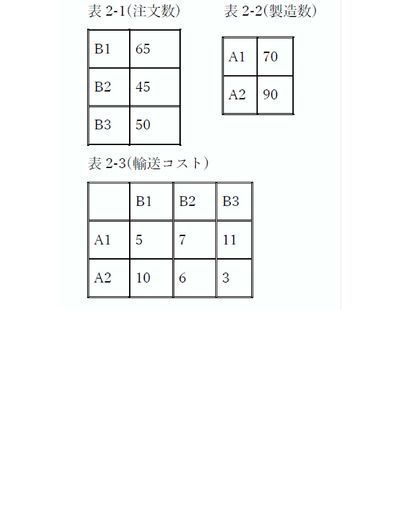 製品を2つの工場A1,A2で製造し3社B1,B2,B3に納入している企業がある.これら3社からの注文は表2-1の通りである.この注文に応じるため表2-2のように工場A1,A2で製品を製造する. 製造した製品を工場A1,A2からそれぞれB1,B2,B3に輸送する際の1単位当たりのコストは表2-3の通りである. 3社B1,B2,B3からの注文を充足し,かつ,輸送コストを最小にするには, 工場A1,A2から3社B1,B2,B3への輸送数をどのように配分すれば良いか.