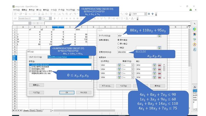 この作成例では セル B2,C2,D2 が 製品A,B,Cのそれぞれの生産量 $x_1,x_2,x_3$を表す.